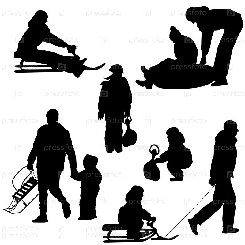 Набор черных силуэтов людей, катающихся на санках