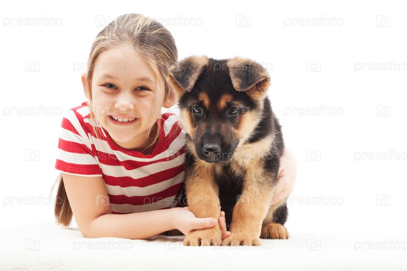 Маленькая девочка и щенок овчарки