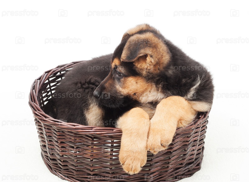 Красивый щенок в плетеной корзине