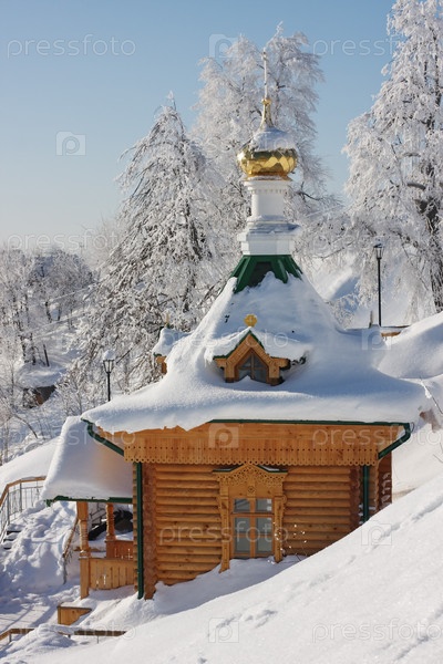 Заснеженная деревянная часовня