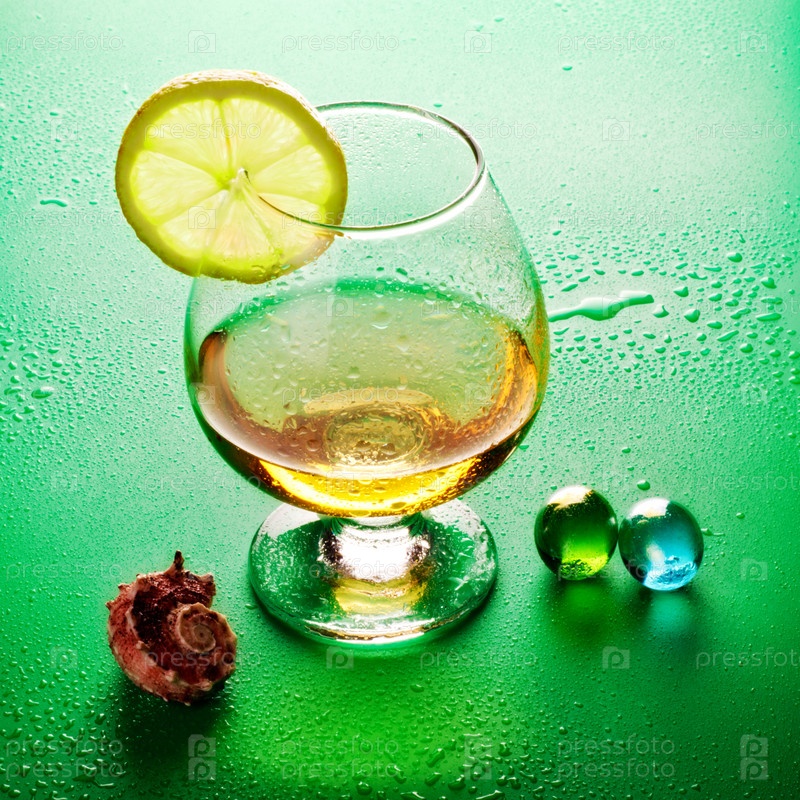 Коктейль с ломтиком лимона на влажной поверхности