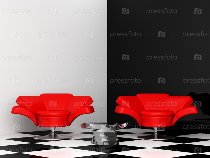 Черно-белый интерьер с двумя красными креслами 3d