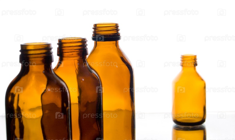 Желтые стеклянные бутылочки из-под лекарств на белом фоне