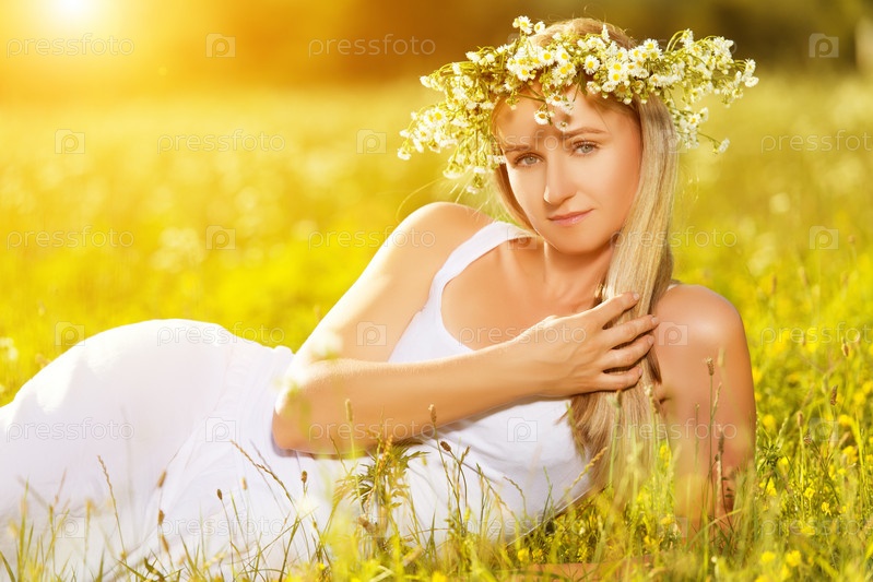Красивая женщина в венке из цветов на поляне