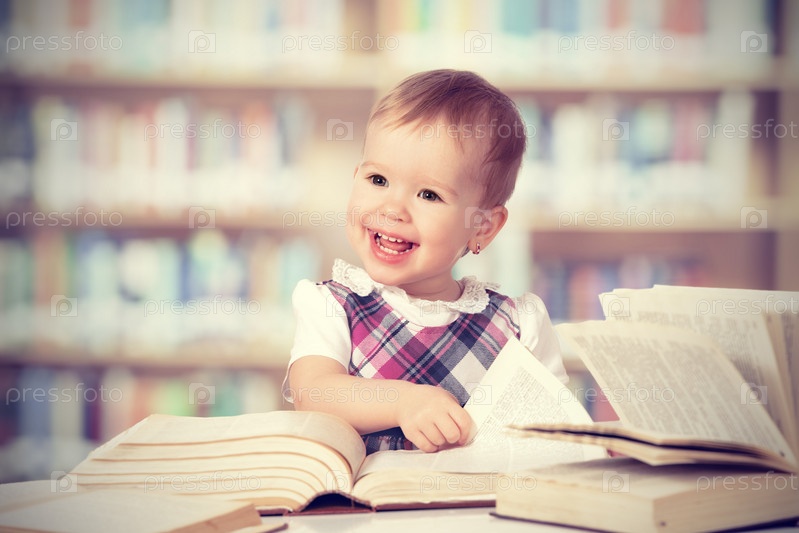 Счастливая девочка читает книгу в библиотеке