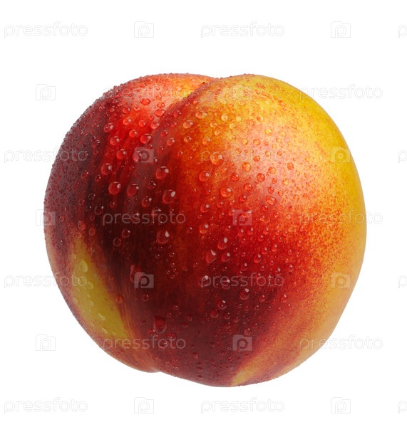 Спелый нектарин в каплях воды, изолирован на белом фоне