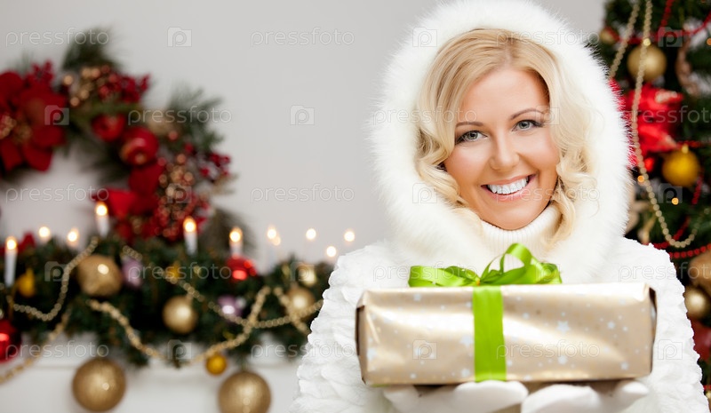 Улыбающаяся женщина с новогодним подарком