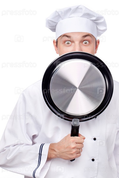 Шеф-повар со сковородой на белом фоне