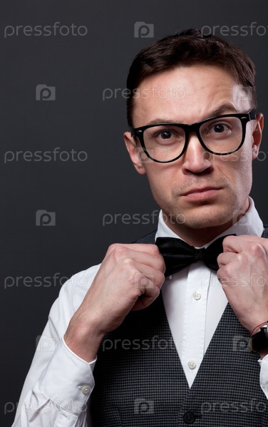 Мужчина с бородой поправляет бабочку