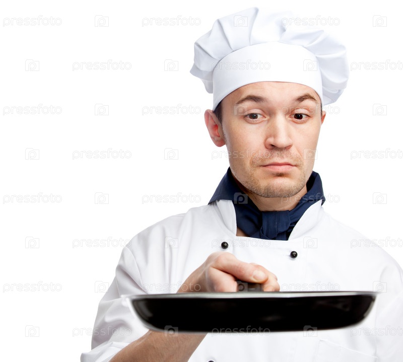 Шеф-повар со сковородой на белом фоне