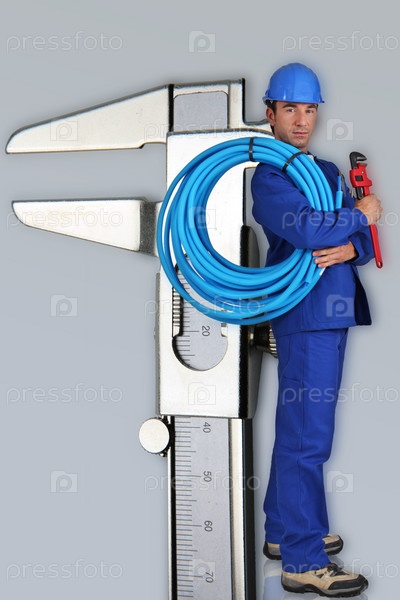 Сантехник рядом с гигантским разводным ключом