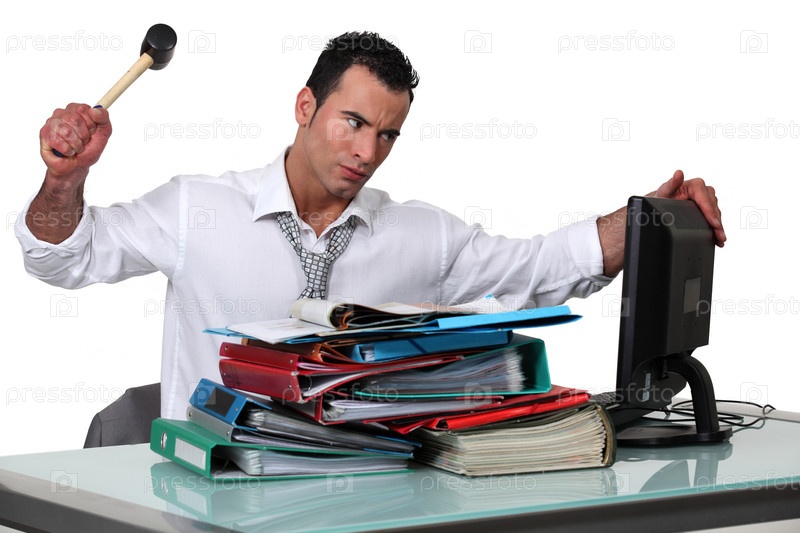 Человек, замахнувшийся молотком на компьютер