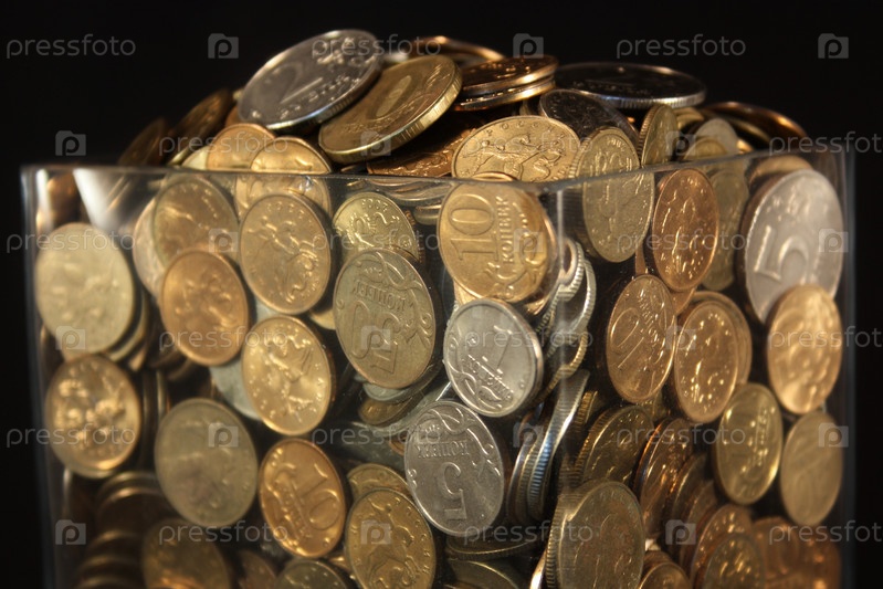 Монеты в стеклянной банке на черном фоне