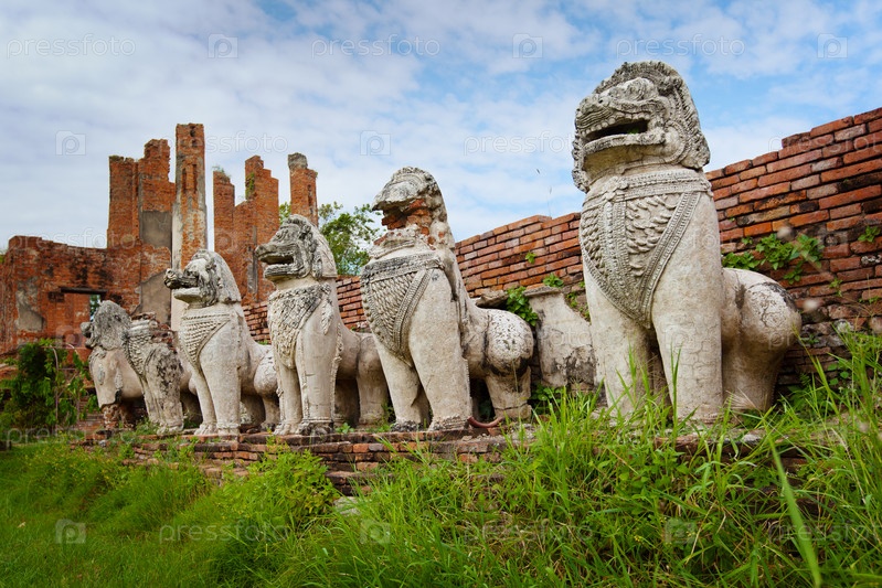 Каменные львы в руинах древнего храма. Таиланд, Аютайя