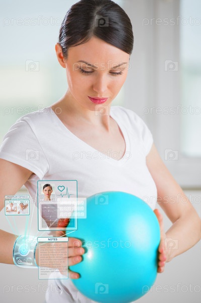 Женщина делает упражнения с мячом с электронными часами