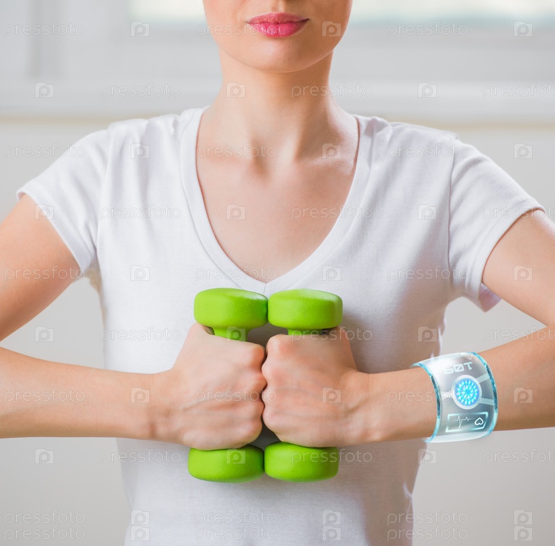 Женщина с электронными часами поднимает гантели