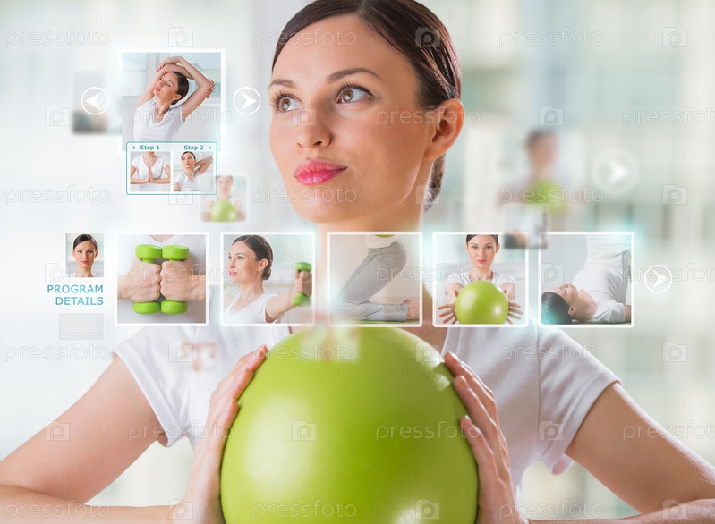 Спортивная женщина занимается спортом с помощью современного виртуального интерфейса