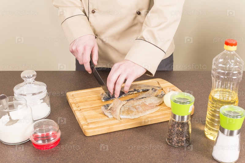Повар режет сельдь