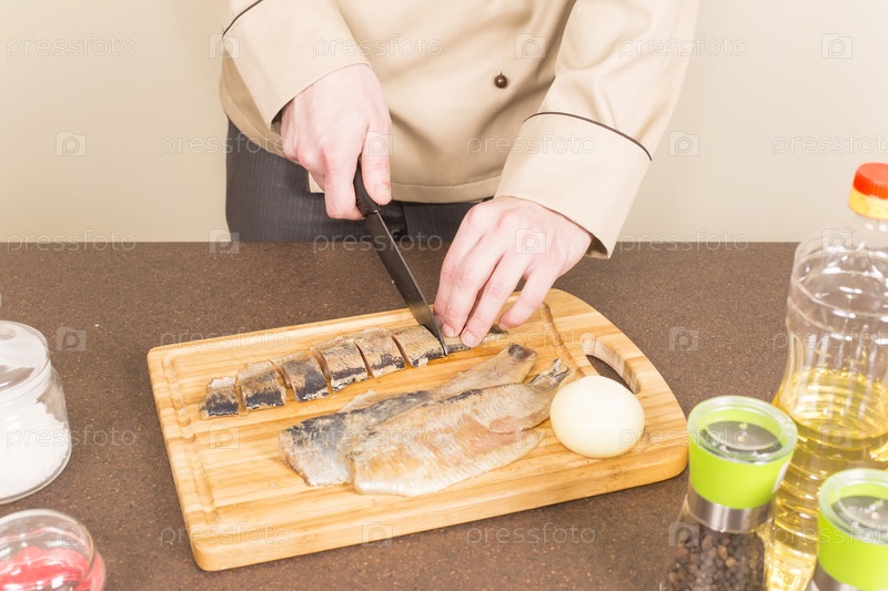 Повар режет сельдь