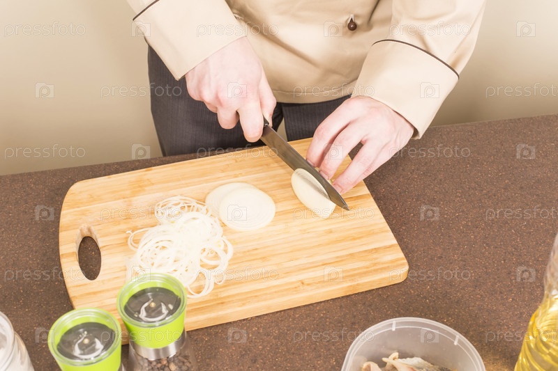 Повар режет лук кольцами