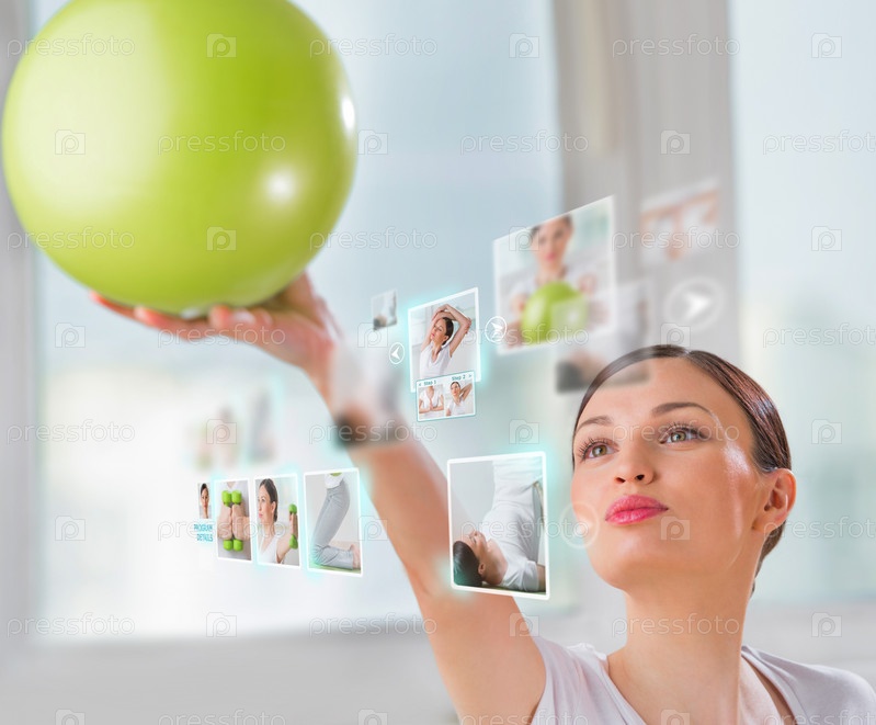 Женщина делает упражнения с помощью виртуального интерфейса