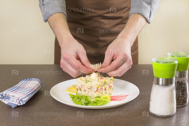 Повар украшает крабовый салат