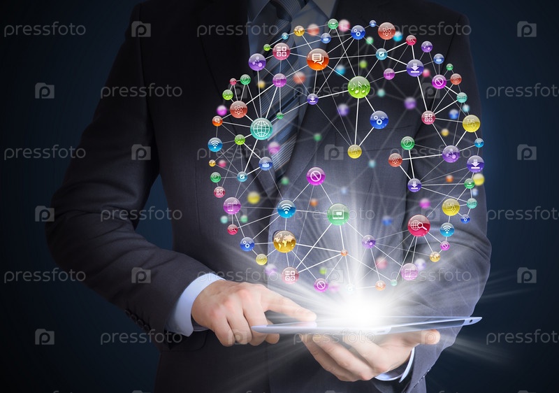 Человек в костюме держит планшетный компьютер