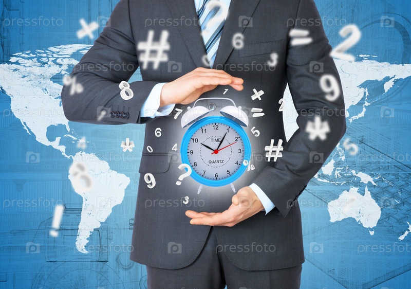 Человек в костюме держит будильник