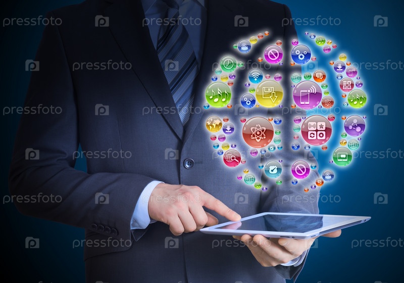 Бизнесмен в костюме держит планшетный компьютер