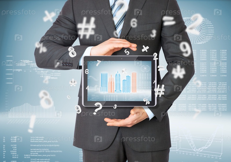 Бизнесмен в костюме держит планшетный компьютер