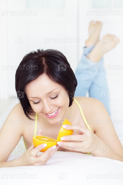 Счастливая брюнетка с половинками апельсина