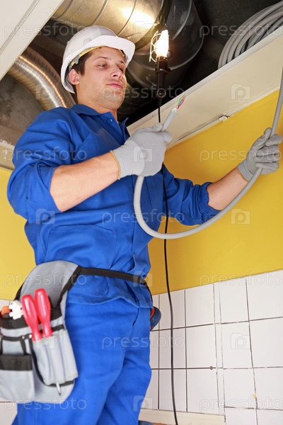Рабочий ремонтирует электропроводку