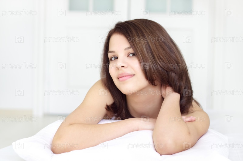 Улыбающаяся молодая девушка, лежащая в постели