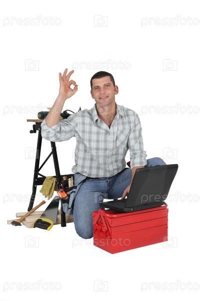 Рабочий с ноутбуком и инструментами