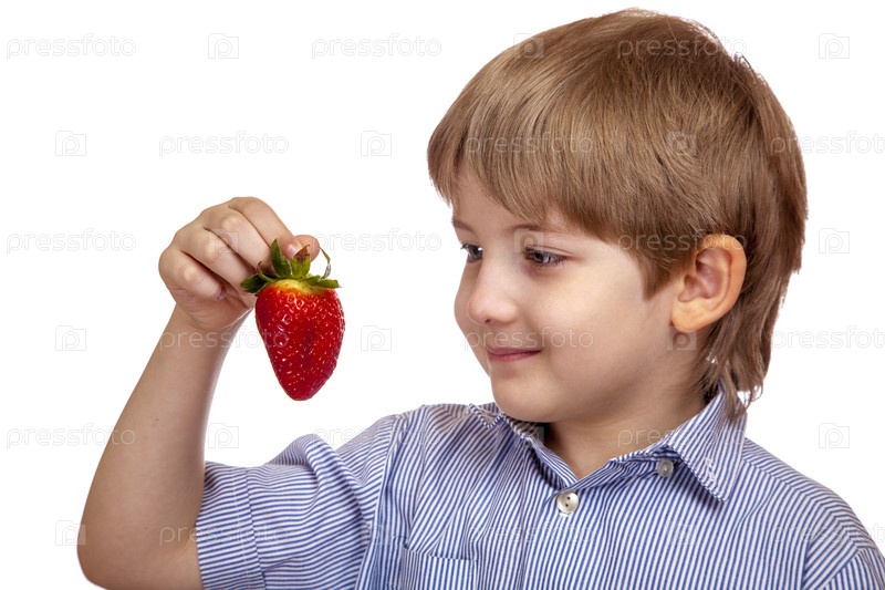 Красивый мальчик смотрит на спелую клубнику