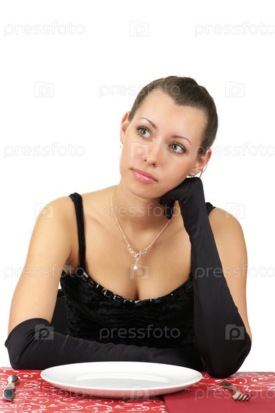 Нарядная девушка сидит в ресторане перед пустой тарелкой