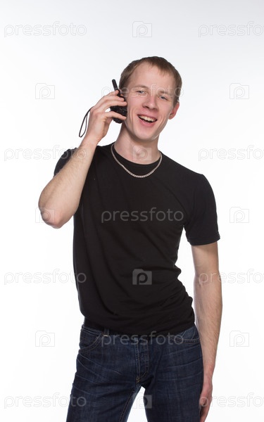Молодой охранник говорит по рации