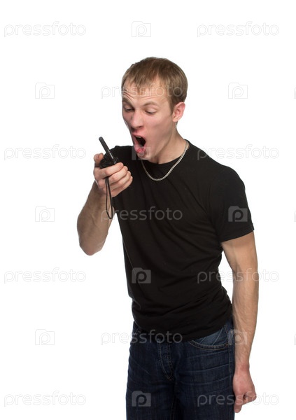 Молодой охранник говорит по рации