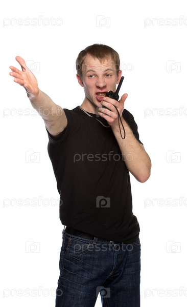 Молодой охранник говорит по рации