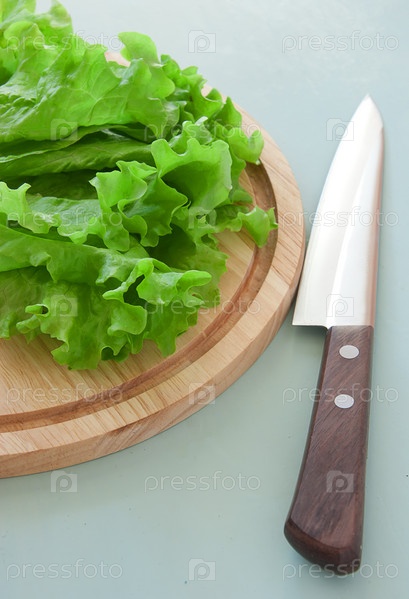 Зеленый салат, лежащий на разделочной доске