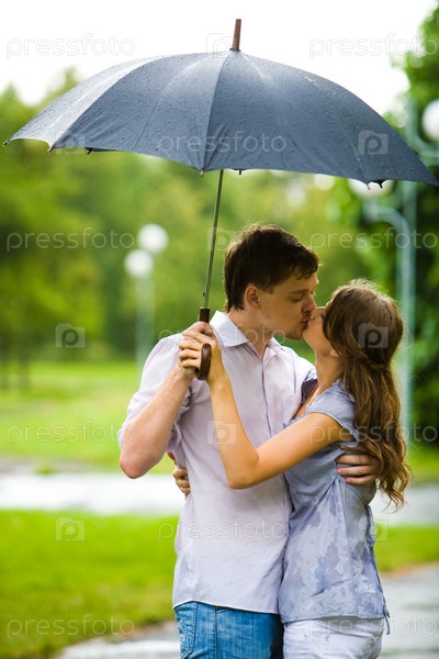 Портрет романтической пары, обнимающей и целующейся под зонтиком во время дождя