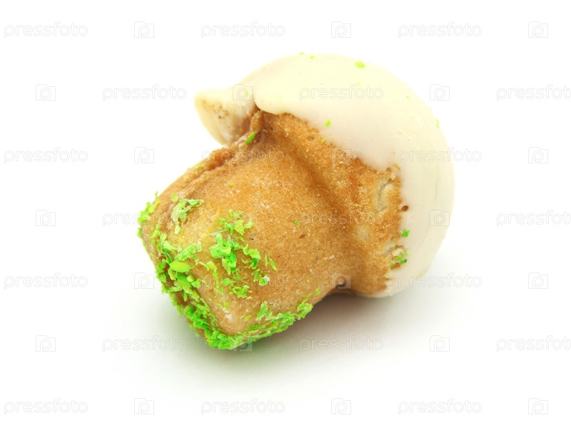 Песочное пирожное со сгущенным молоком в форме гриба на белом фоне