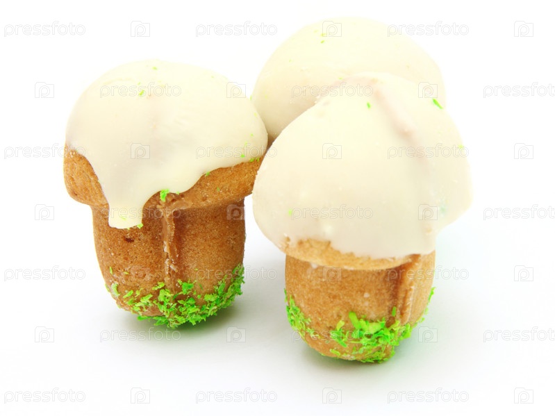 Песочное пирожное со сгущенным молоком в форме гриба на белом фоне