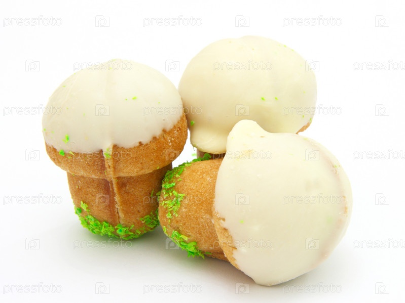Песочное пирожное со сгущенным молоком в форме гриба на белом фоне
