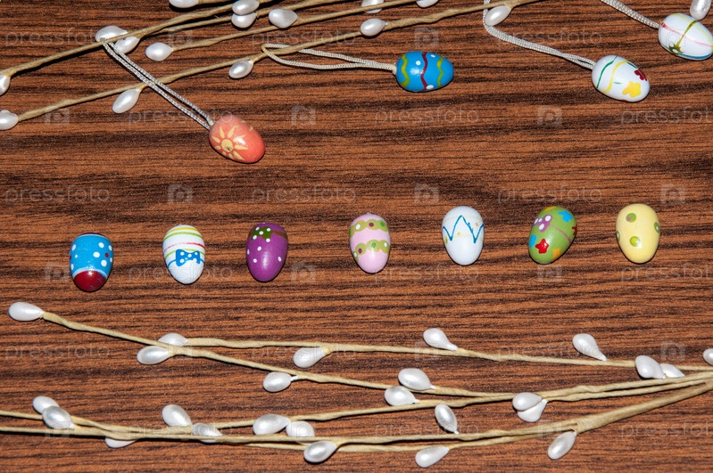 Окрашенные пасхальные яйца и веточка вербы