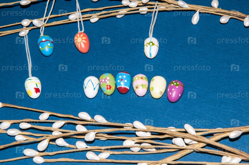 Окрашенные пасхальные яйца и веточка вербы