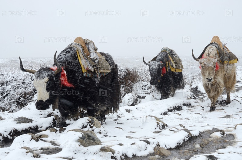 Караван из яков в метель, Непал, Гималаи, район Джомолунгмы
