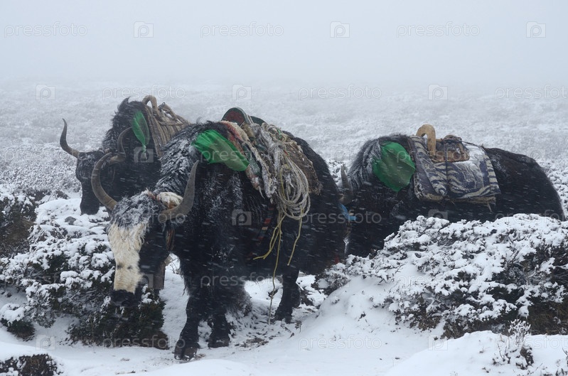 Караван из яков в метель, Непал, Гималаи, район Джомолунгмы