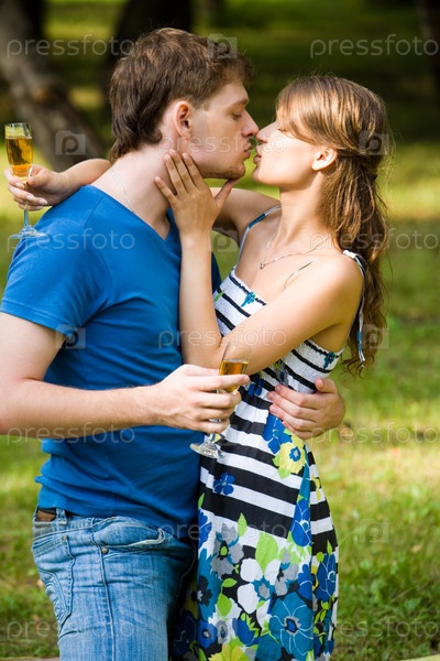 Портрет влюбленной пары, держащей бокалы с вином и стремящейся к поцелую на сельской местности