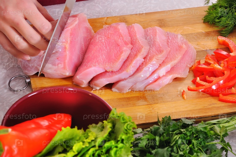 Повар режет мясо